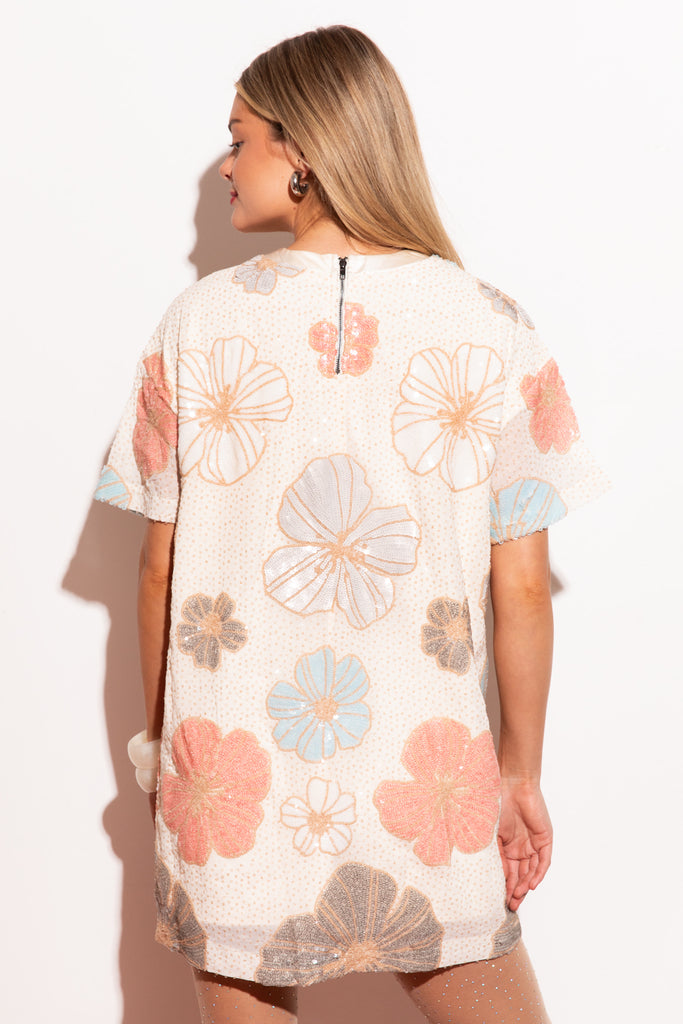 Catch everyone's attention with this flirty sequin t-shirt mini dress. Features sequin floral design. Includes a back zipper for a perfect fit and is fully lined for added comfort.