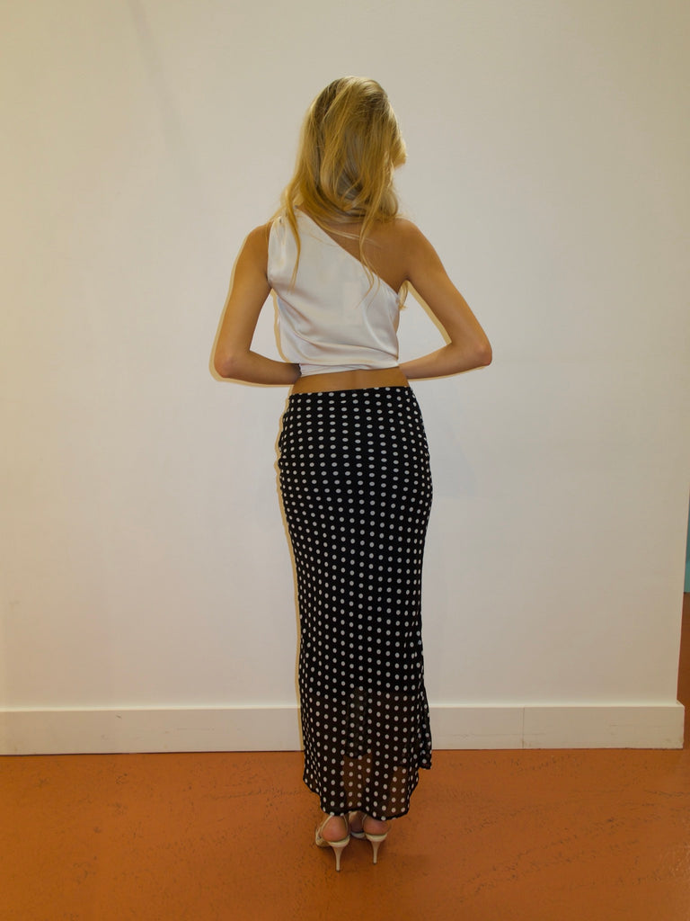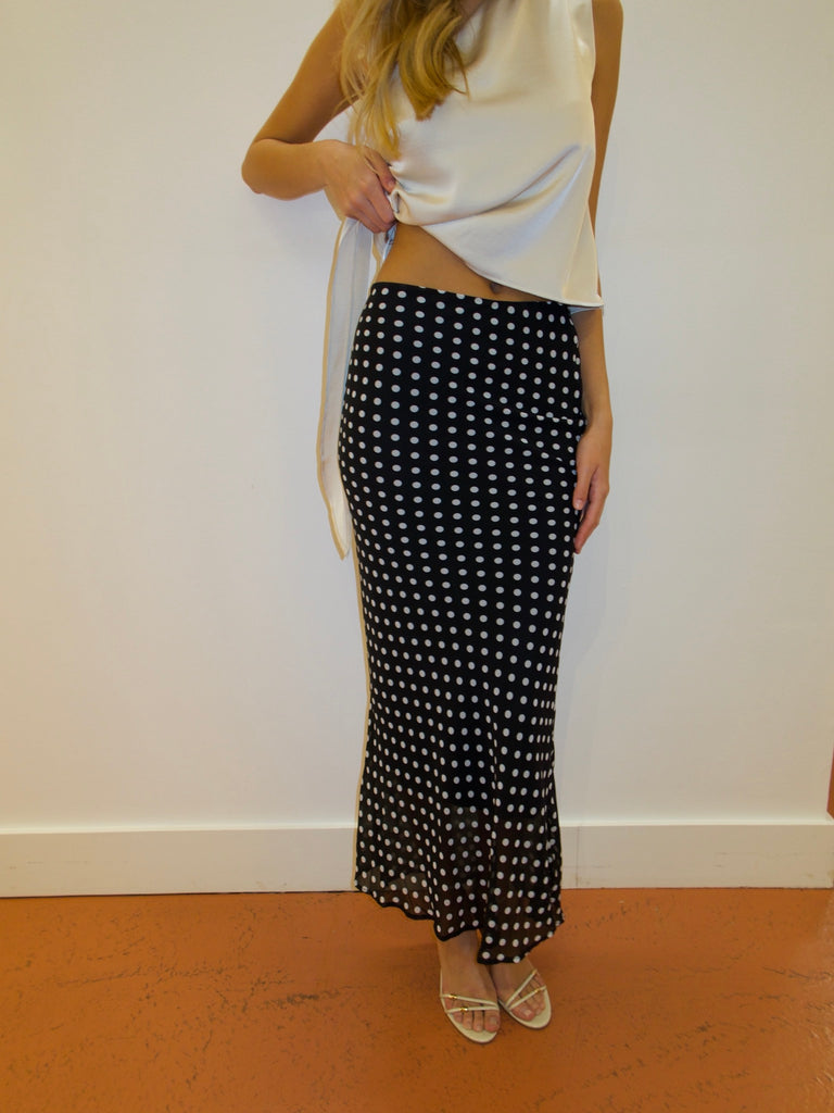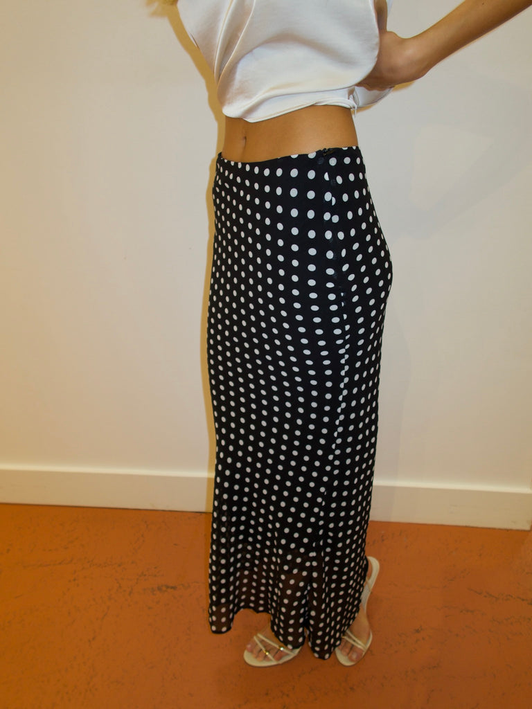The Camden Skirt is on trend with the cutest print of the season: polka dots. This column maxi skirt features an elastic waistband with a high rise fit. Comes fully Lined. Pro tip: Size up for a more low rise fit.