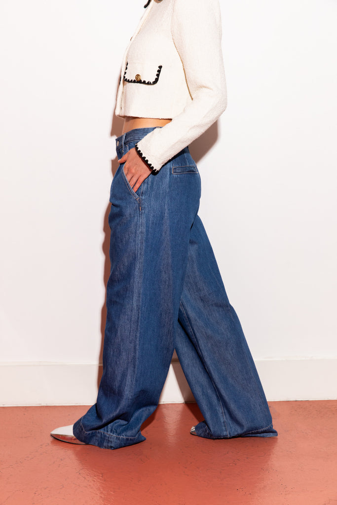Discover your new go-to denim with the Victoria Trouser. Featuring a high rise and wide leg, this denim trouser offers a relaxed and effortless silhouette. Crafted with a non-stretch, dark indigo wash fabric, it's perfect for a day to night look.