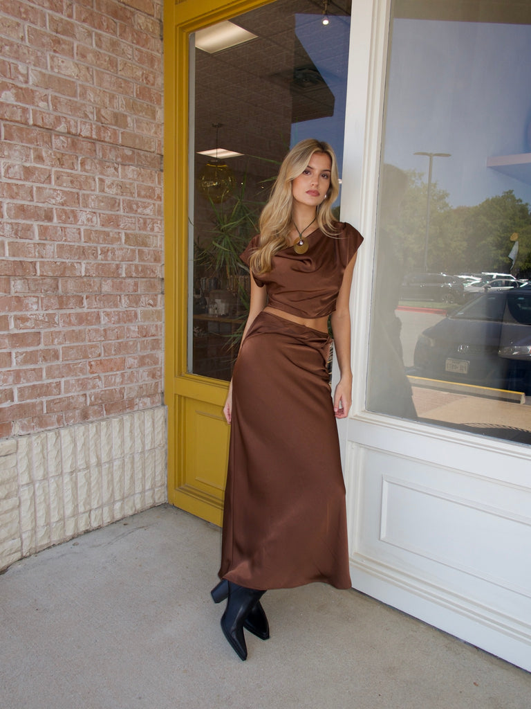 Here for the drama, the Ember Chocolate set is there for you when you need it. Style with the Ember Twist Skirt for a complete look or style separate for multiple looks. The Ember Draped Top features front draping and a back zipper for closure.