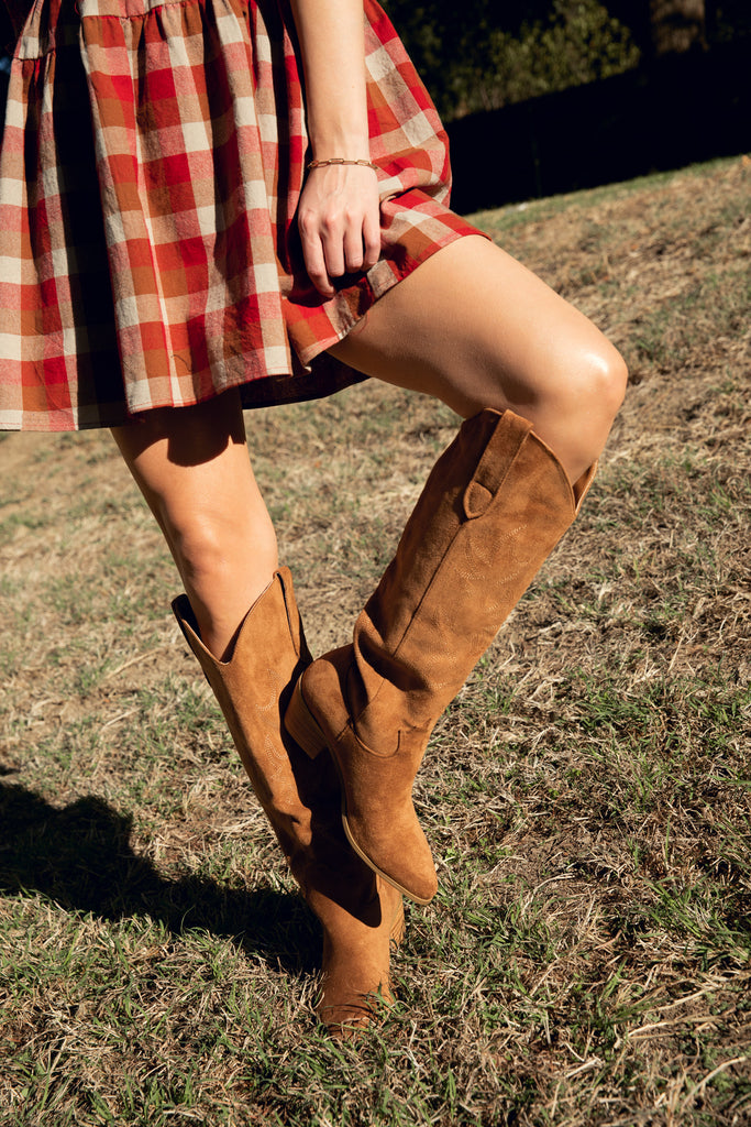The IT boot of the season. This Suede Cowboy Boot comes in a pretty light tan color that styles well with any look. Features a knee high western design and a 2 inch block heel and side pull tabs.