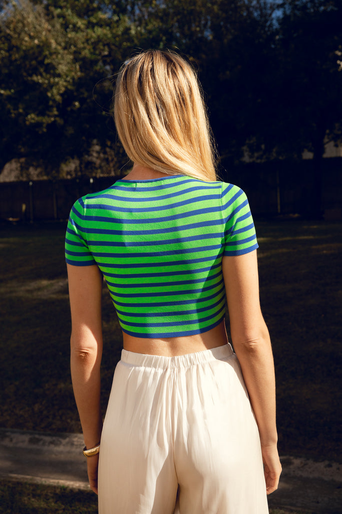 The Roxy Top is our go-to summer time style. Designed with vibrant blue and green stripes and a body hugging fit - we cant wait to pair it with a flowy skirt or pant for the season.