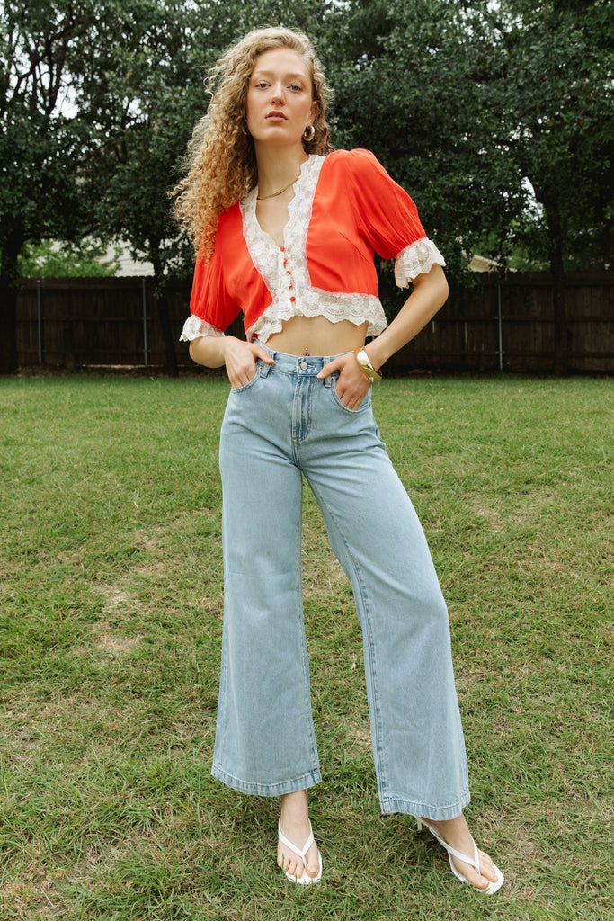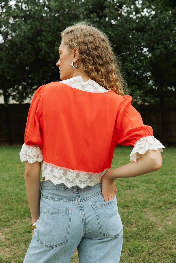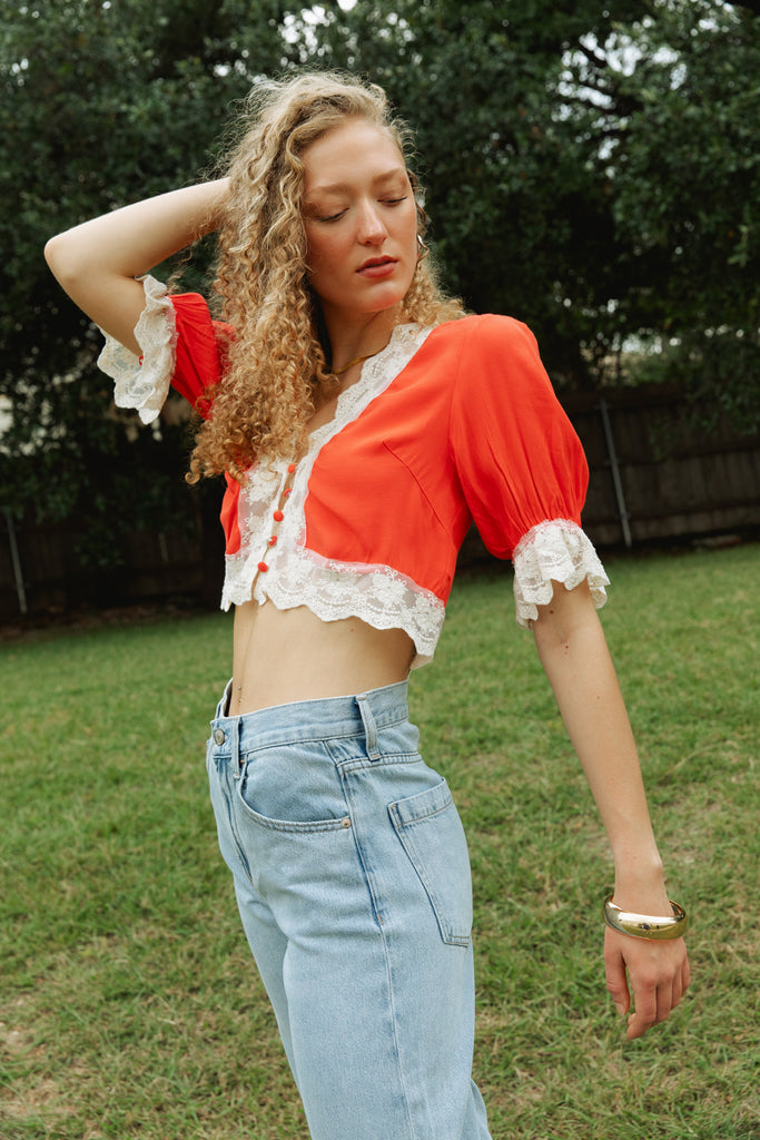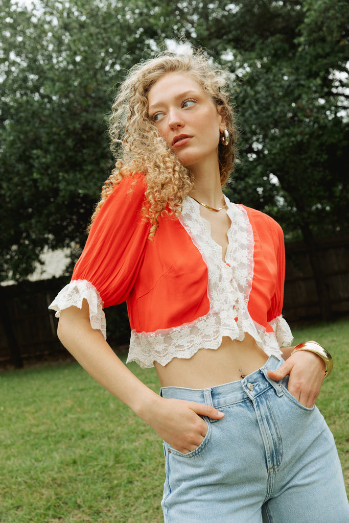 Designed with a pretty red hue and lace trim with front button closures. Wear it to your next happy hour for instant compliments.