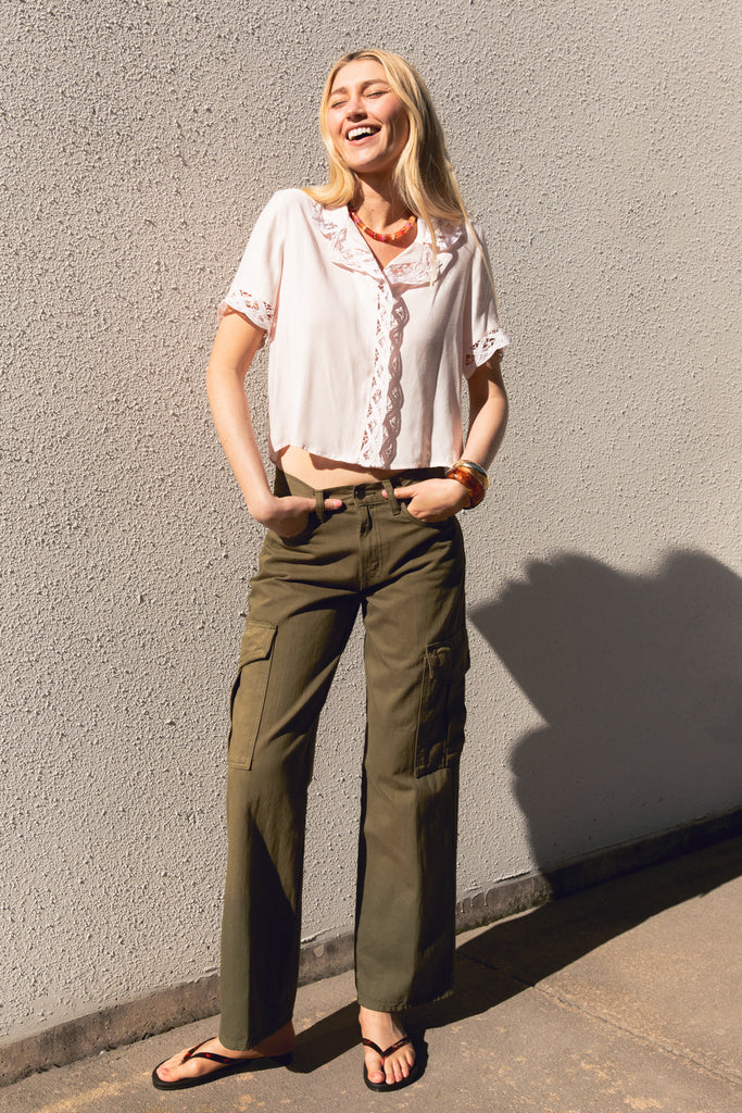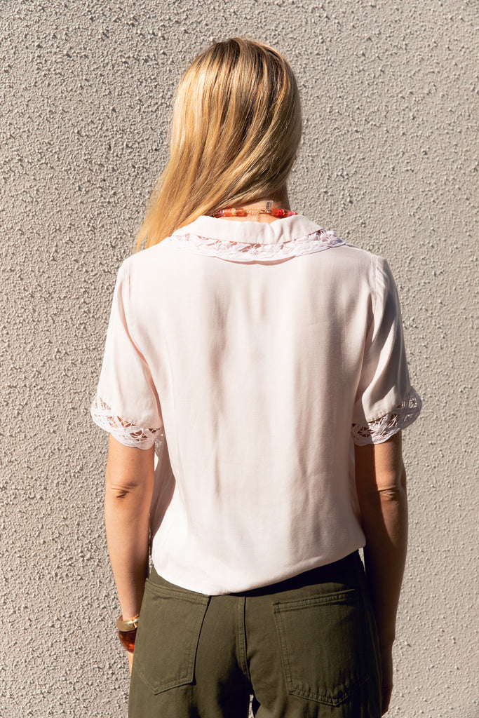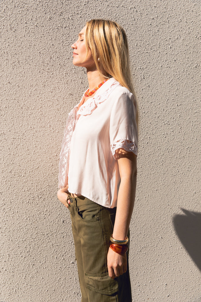 This pretty blush lace trim blouse comes with a slightly cropped fit, hidden front buttons, lace trim detail at the collar and collar.