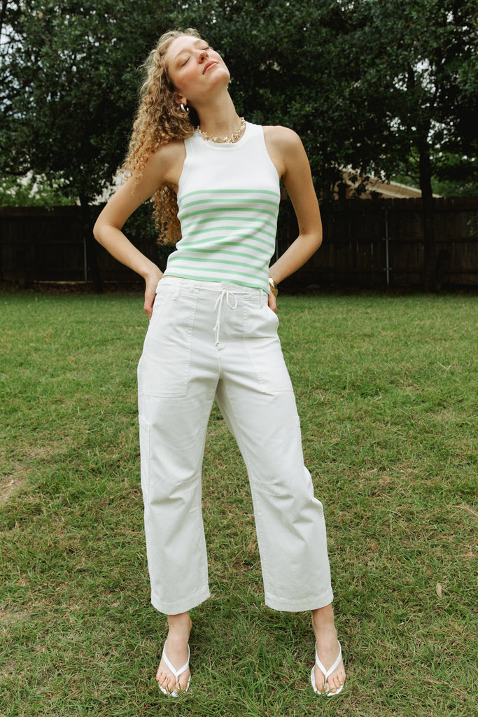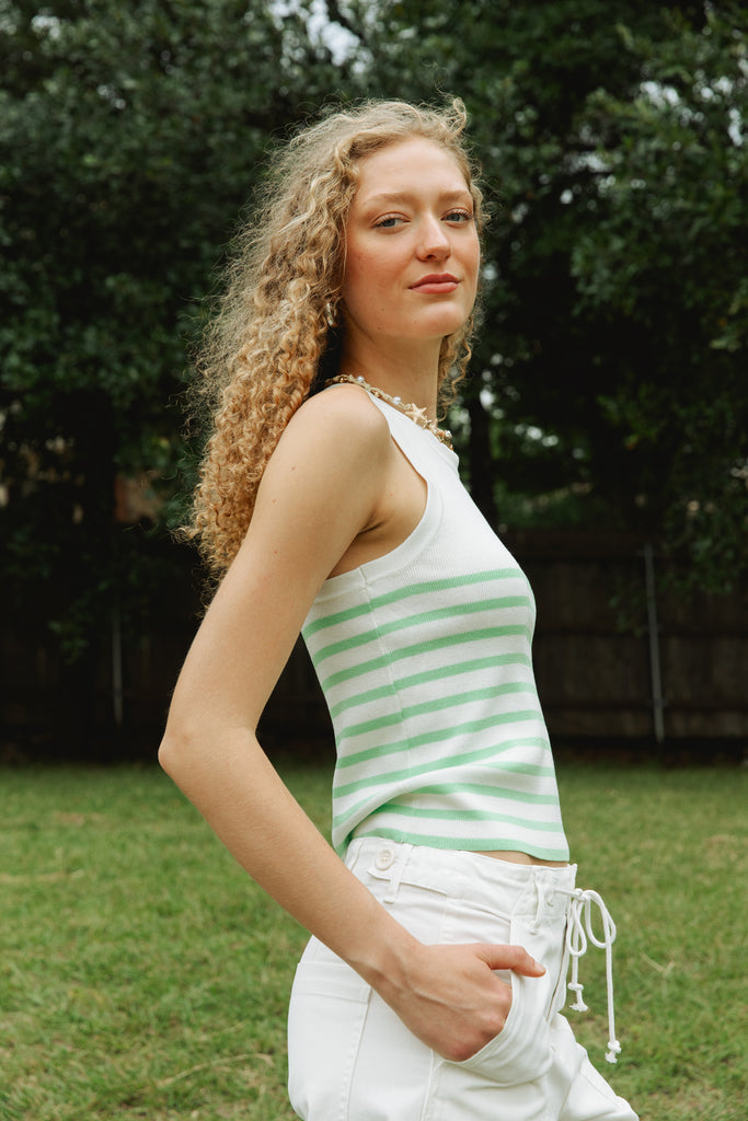 A basic with a cute twist - we love it's mint green striped print with a classic ribbed tank style. Pair with any denim for an effortless look